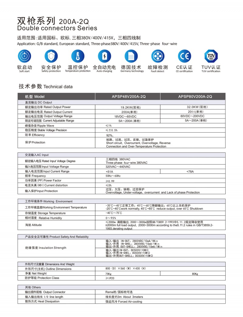 觸摸屏智能操作設(shè)計(jì):告別傳統(tǒng)按鍵方式,給您帶來更現(xiàn)代更具科技智能的操作體驗(yàn) 自動充電:插槍自動充電,簡化充電流程,便于操作 兼容性高:80V200A兼容48V200A充電 多重保護(hù): 輸出短路,過流過壓保護(hù),反接保護(hù),電流導(dǎo)管保護(hù)等多重保護(hù) 預(yù)約充電功能:避開高峰用電時(shí)段,有效節(jié)省成本 雙語切換:中英文雙語隨需切換,跨越語言障礙,與世界接軌 人性化設(shè)計(jì):充電機(jī)背板內(nèi)部附部件明細(xì)及產(chǎn)品接線圖,方便客戶可更清楚的了解產(chǎn)品,便于維修,提高售后時(shí)效 獨(dú)特設(shè)計(jì): 內(nèi)置電磁鎖驅(qū)動模塊,防止臨時(shí)斷電鎖槍 使用壽命更長:功率模塊預(yù)留20%空間,提高模塊的使用壽命 出色內(nèi)部結(jié)構(gòu): 內(nèi)部結(jié)構(gòu)左右出風(fēng),內(nèi)部電路不容易積粉塵,提高充電機(jī)壽命