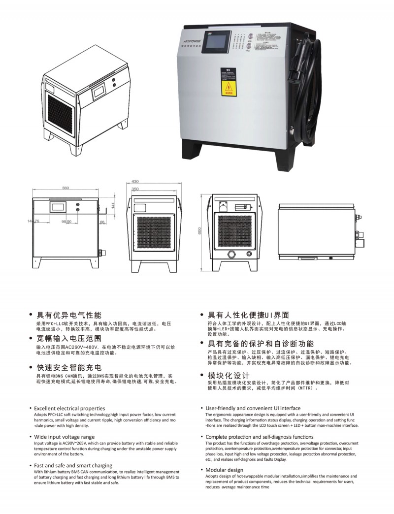 觸摸屏智能操作設(shè)計:告別傳統(tǒng)按鍵方式,給您帶來更現(xiàn)代更具科技智能的操作體驗 自動充電:插槍自動充電,簡化充電流程,便于操作 兼容性高:80V200A兼容48V200A充電 多重保護: 輸出短路,過流過壓保護,反接保護,電流導(dǎo)管保護等多重保護 預(yù)約充電功能:避開高峰用電時段,有效節(jié)省成本 雙語切換:中英文雙語隨需切換,跨越語言障礙,與世界接軌 人性化設(shè)計:充電機背板內(nèi)部附部件明細及產(chǎn)品接線圖,方便客戶可更清楚的了解產(chǎn)品,便于維修,提高售后時效 獨特設(shè)計: 內(nèi)置電磁鎖驅(qū)動模塊,防止臨時斷電鎖槍 使用壽命更長:功率模塊預(yù)留20%空間,提高模塊的使用壽命 出色內(nèi)部結(jié)構(gòu): 內(nèi)部結(jié)構(gòu)左右出風(fēng),內(nèi)部電路不容易積粉塵,提高充電機壽命