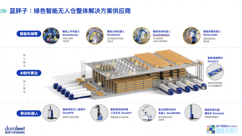 上件機器人DoraInductor、分揀機器人DoraSorter、包裝機器人DoraPacker、復合型移動協作機器人DoraMOMA等智能機器人齊上陣,讓人眼前一亮。值得一提的是,藍胖子裝載機器人DoraLoader也在媒體開放日上首度曝光,將在不久的未來落地實際應用。