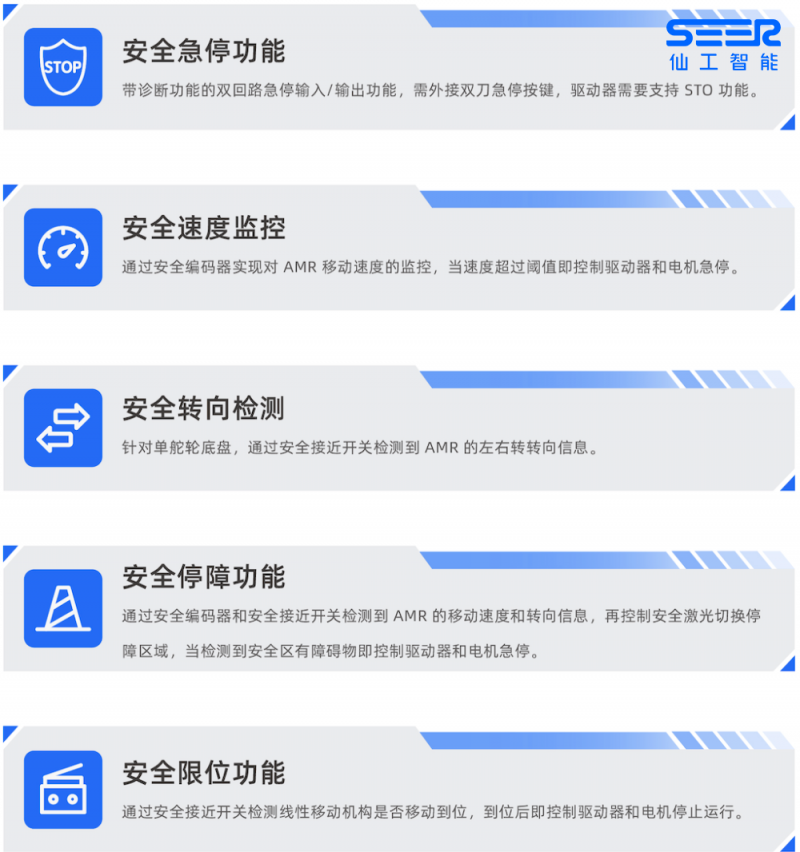 仙工智能以智能控制器和數字化軟件為核心的產品組合中,將安全作為第一要義,從產品研發到產品測試到最終交付,始終貫徹安全守護課題,為客戶打造更安全的 AMR。