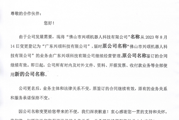 因企業(yè)發(fā)展需要,2023年8月14日我司名稱由佛山市興頌機器人科技有限公司變更為廣東興頌科技有限公司。在2023年8月14日前,由...