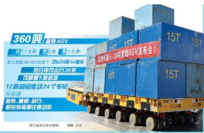 朗譽機器人360噸重載AGV近期成功下線,該產品能實現升降行程300mm,最大承載360噸,最大運行速度30m/min,爬坡能力5°,續航時間大于8小時,充電時間只需要3小時,控制方式為遙控駕駛,后期可以做無人駕駛升級,防護等級為IP66,并獲得歐洲CE安全認證的重載AGV。
