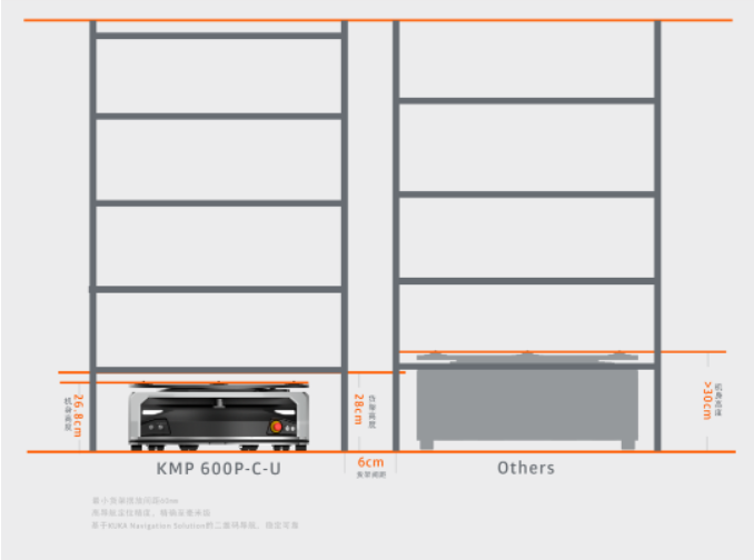 基于KUKA Navigation Solution的二維碼導(dǎo)航技術(shù),KMP 600P-C-U擁有穩(wěn)定出色的導(dǎo)航系統(tǒng),全面優(yōu)化的運(yùn)動(dòng)控制精度鏈,可達(dá)到毫米級(jí)定位精度,具備貨架擺放位置調(diào)整功能,輕松實(shí)現(xiàn)1.3*1.3m大尺寸移動(dòng)貨架的擺放間距6cm需求,為倉(cāng)庫(kù)贏得更多平面空間,大大增加倉(cāng)庫(kù)容積率,進(jìn)而降低成本。