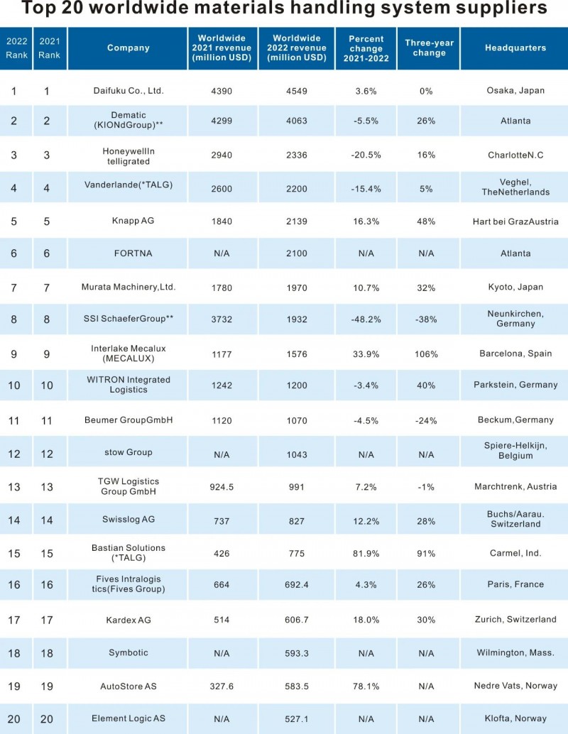 大福仍然以 45.4 億美元的年銷售額位居榜單第一,高于 2021年的  43.9 億美元收入。大福將其持續增長歸功于上一年的大量訂單積壓、對半導體制造商的強勁銷售、零售和電子商務部門系統的擴展以及服務收入的提高。
