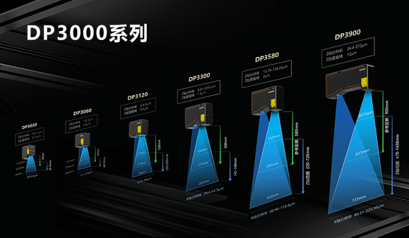 DP3000系列推出六款型號,輪廓點數升級為3200點,最高檢測頻率提升到19KHz,在超高精度測量方向,進一步擴充了DP3020型號,覆蓋11.5-14mm的X軸寬度,實現0.15um的Z軸重復精度,同時DP3300和DP3580兩個版本同樣支持紅藍光兩個版本選配。