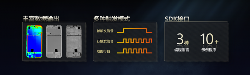 相機對外提供豐富的數據接口,包括輪廓數據、點云數據、深度圖、亮度圖同時兼容多種觸發模式,支持差分編碼器觸發輸入,支行觸發、幀觸發,行+幀觸發的應用模式。通過SDK集成激光輪廓傳感器到第三方軟件框架,提供C、C#、Python三種語言版本的SDK,包括主流視覺分析軟件在內的10多種集成使用示例,便于用戶的二次開發。
