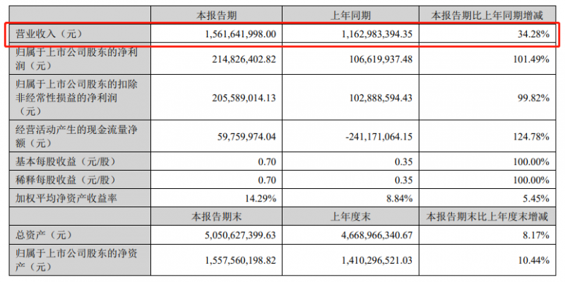 今天國際8月22日發(fā)布半年度業(yè)績(jī)報(bào)告稱,2023年上半年?duì)I業(yè)收入約15.62億元,同比增加34.28%;歸屬于上市公司股東的凈利潤(rùn)約2.15億元,同比增加101.49%;基本每股收益0.7元,同比增加100%。