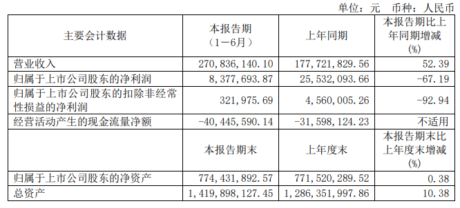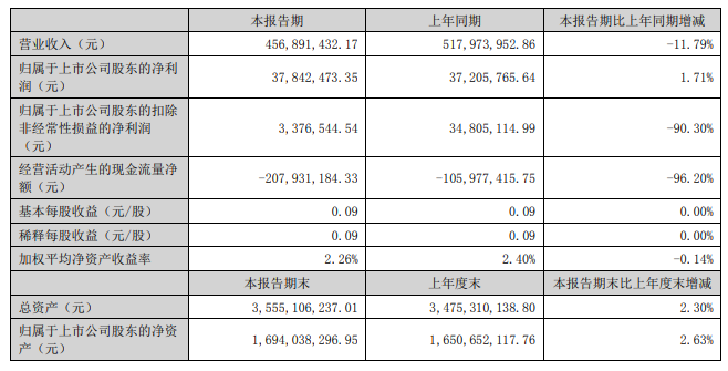 東杰智能8月29日發(fā)布半年度業(yè)績(jī)報(bào)告稱,2023年上半年?duì)I業(yè)收入約4.57億元,同比減少11.79%;歸屬于上市公司股東的凈利潤(rùn)約3784萬元,同比增加1.71%;基本每股收益0.09元,同比增加0%。