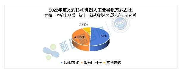根據CMR產業聯盟數據,新戰略移動機器人產業研究所統計,2022年,SLAM導航(激光+視覺)的無人叉車占比首次超過了激光有反射板叉車,成為市場應用主流,占比為51%,激光反射板無人叉車增速不如SLAM導航產品,占比下降,為41.22%。