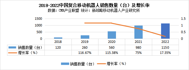 根據(jù)CMR產(chǎn)業(yè)聯(lián)盟數(shù)據(jù),新戰(zhàn)略移動(dòng)機(jī)器人產(chǎn)業(yè)研究所統(tǒng)計(jì), 2022年度中國(guó)市場(chǎng)新增復(fù)合移動(dòng)機(jī)器人1150臺(tái),從2018年的120臺(tái)到2022超千臺(tái),近年來復(fù)合機(jī)器人落地應(yīng)用逐漸增多。