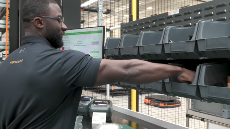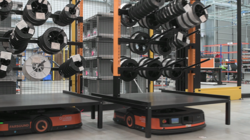 Farsound定制了多種貨架來滿足不同種類零部件的搬運(yùn)需求;同時,海康機(jī)器人LMR可實(shí)現(xiàn)貨架的柔性適配。