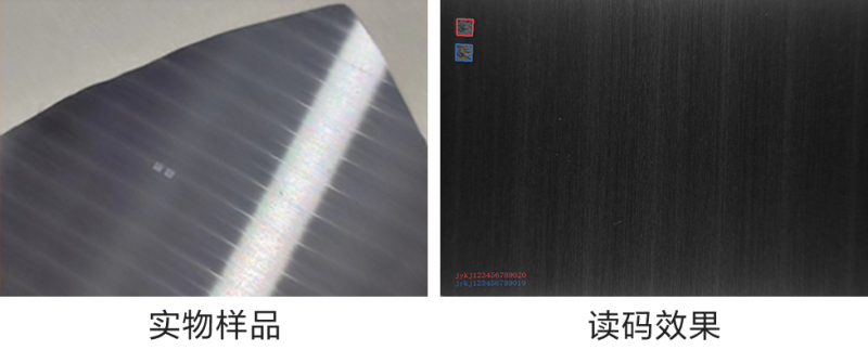 需求:光伏硅片生產(chǎn)的質(zhì)量追溯,硅片上激光鐳雕的極小碼讀取,碼大小0.6*0.6mm,通過刻印兩個(gè)二維碼增加識(shí)別率,安裝空間180mm以內(nèi)。