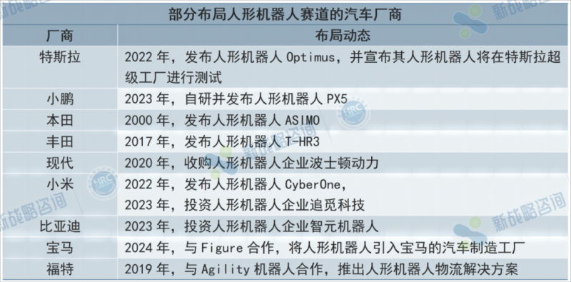 除了特斯拉、寶馬、本田和現(xiàn)代汽車等國際汽車制造商,國內(nèi)越來越多的車企也開始進(jìn)入人形機(jī)器人領(lǐng)域。在過去的半年里,多家車企進(jìn)入了這一領(lǐng)域,如比亞迪投資了人形機(jī)器人初創(chuàng)公司智元機(jī)器人,小鵬汽車發(fā)布了自主研發(fā)的人形機(jī)器人PX5,小米推出了人形仿生機(jī)器人CyberOne等。