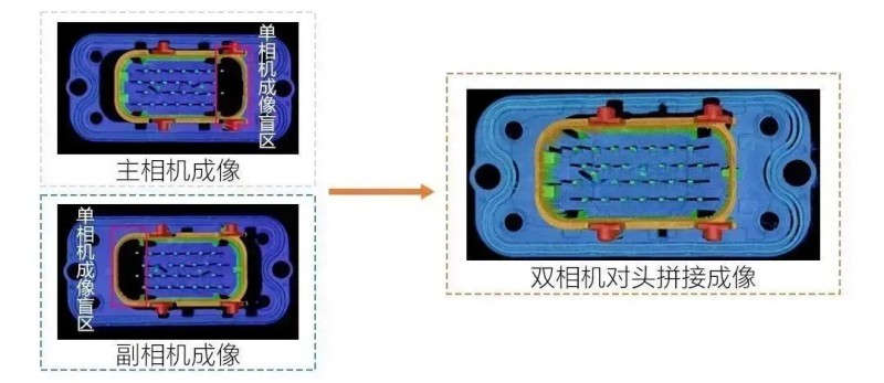 方案優(yōu)勢:通過雙相機對頭拼接的方式消除連接器側(cè)壁導致的盲區(qū),單次掃描出圖即可進行pin針位置度檢測
