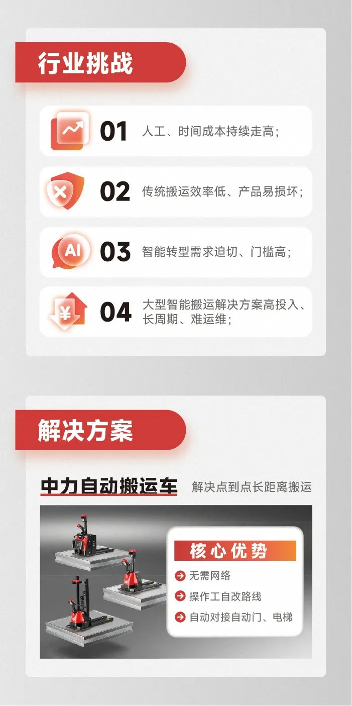基于對(duì)市場(chǎng)的深度洞察,去年以來(lái)中力定義行業(yè)新概念——自動(dòng)搬運(yùn)車,專注解決點(diǎn)到點(diǎn)長(zhǎng)距離無(wú)效搬運(yùn),破解用工難題。基于精準(zhǔn)高效的自動(dòng)配送,中力自動(dòng)搬運(yùn)車助力生產(chǎn)效率大幅提升!