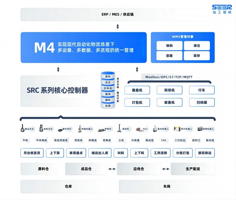 M4 集成 RCS、WCS、WMS 功能于一身,一體化管理解決機(jī)器人管理與運(yùn)單管理問(wèn)題、各類與機(jī)器人配合作業(yè)的自動(dòng)化設(shè)備管理問(wèn)題、入庫(kù)出庫(kù)等倉(cāng)儲(chǔ)業(yè)務(wù)問(wèn)題,降低系統(tǒng)對(duì)接及維護(hù)成本,打破多系統(tǒng)間的數(shù)據(jù)孤島。
