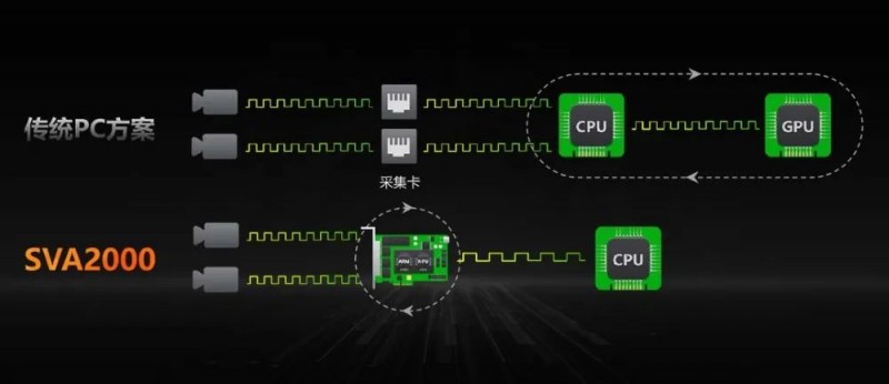 數(shù)據(jù)流無需經(jīng)過CPU,在SVA2000上即可完成全部視覺功能,CPU只在有需要時做少量的控制功能,大大降低了CPU負(fù)載,在某些應(yīng)用中甚至不需要CPU參與工作。