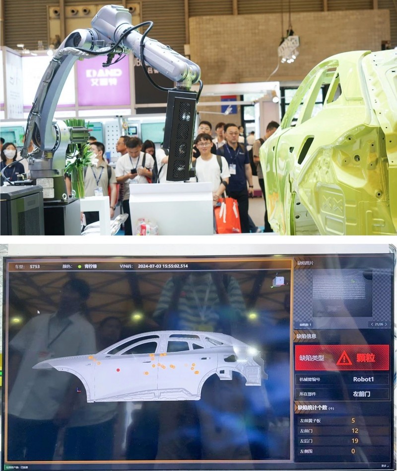采用海康機(jī)器人自研的程控條紋光傳感器進(jìn)行采圖,對(duì)車漆表面的顆粒,漆疤、劃痕、氣泡、針眼等缺陷進(jìn)行在線全檢,最小可實(shí)現(xiàn)0.2mm的缺陷檢測(cè),借助機(jī)械臂的柔性,檢測(cè)可達(dá)性區(qū)域幾乎覆蓋100%車身。