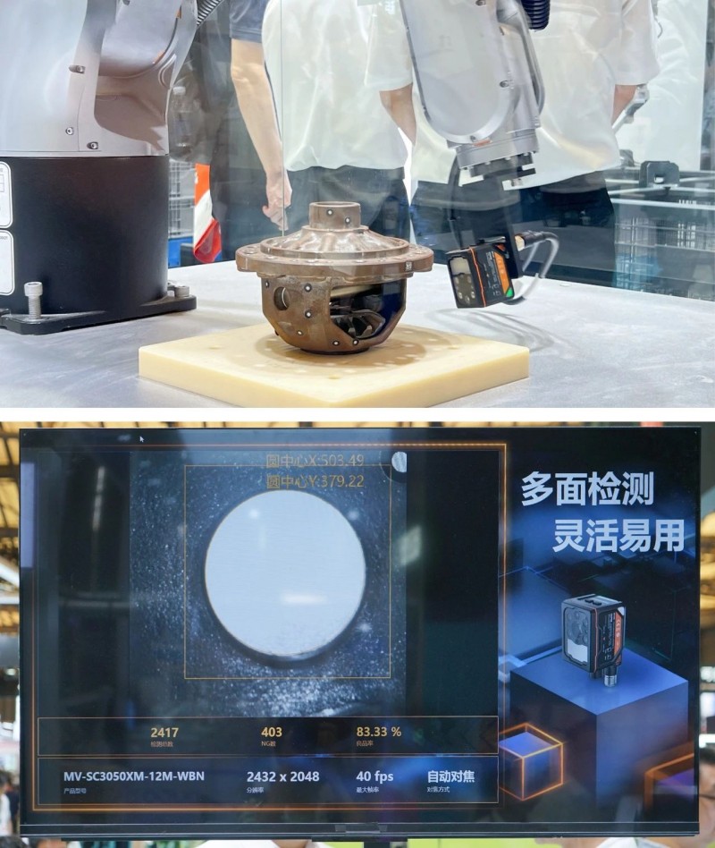 集成像、算法、存儲(chǔ)、通信于一身的SC3000X系列視覺(jué)傳感器,體積小巧,外觀緊湊,安裝更加靈活,內(nèi)部嵌入了讀碼、有無(wú)、正反、測(cè)量、識(shí)別和計(jì)數(shù)等防錯(cuò)檢測(cè)算法,搭配機(jī)械臂對(duì)鑄造件的各個(gè)面進(jìn)行碼信息、字符信息的檢測(cè)。