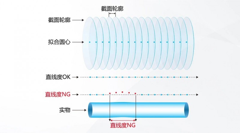 通過對截面數(shù)據(jù)的分析,可以計算出不同截面位置的圓心點坐標(biāo),進而實時監(jiān)控線纜/管材直線度,當(dāng)圓心坐標(biāo)跳動超出一定閾值時,則判定線纜/管材某位置處發(fā)生彎折。