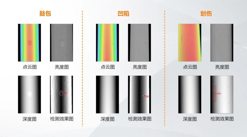 相比傳統(tǒng)游標(biāo)卡尺/測徑儀的測量方式,環(huán)視拼接可實現(xiàn)物料在線、非接觸式直徑測量和表面缺陷檢測;相比單輪廓傳感器方案,獲取信息更加全面,效率更高。