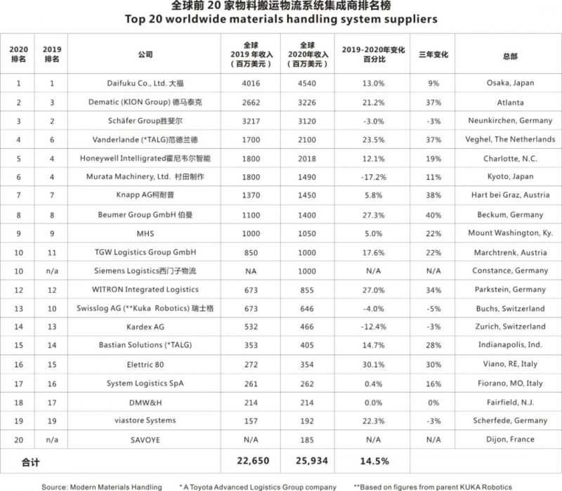 圖表:全球前20家物料搬運系統(tǒng)集成商排名榜