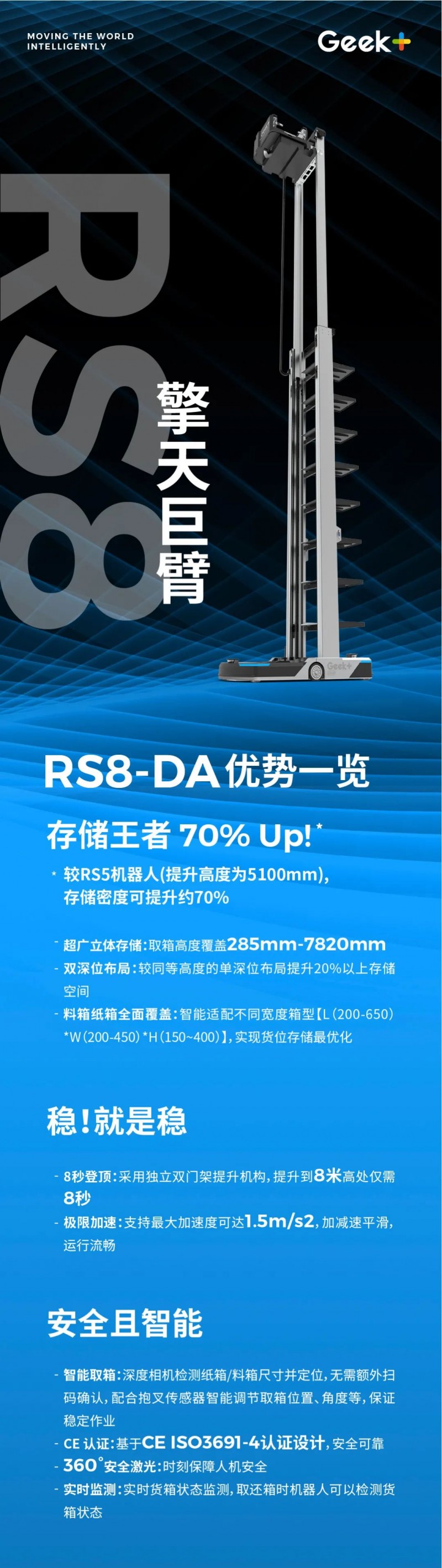 極智嘉重磅發布全新貨箱機器人RS8,最大提升高度超8米