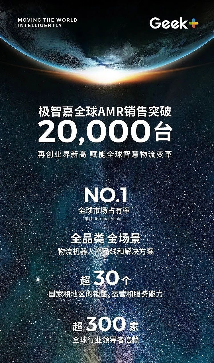 極智嘉是全球AMR市場占有率第一的物流機器人企業,在今年7月2日,極智嘉正式宣布,憑借強大的增長勢能和創新力量,極智嘉全球AMR機器人銷售累計突破2萬臺,并帶領全球AMR行業邁進“兩萬臺時代”,開創行業發展的新篇章。