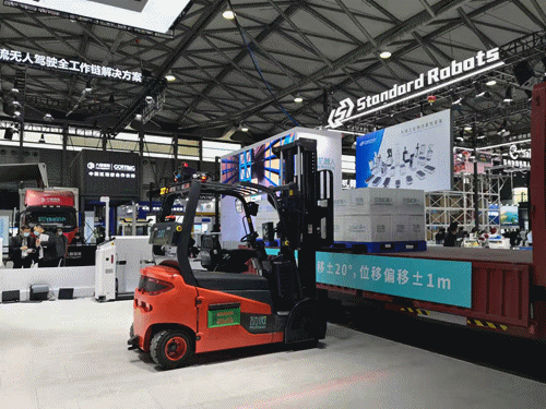 系列無人叉車產品,包括堆高式、平衡重式無人叉車等,并現場演示了月臺貨車裝卸方案。