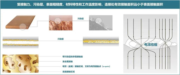 在所有接觸不良火災(zāi)原因中,線路接頭處接觸電阻過大引起的火災(zāi)居于第一位。因此接觸電阻大小直接影響著電連接質(zhì)量,穩(wěn)定的低接觸電阻可以確保電連接長期安全可靠。根據(jù)電接觸理論,金屬接觸表面在微觀條件下總是凹凸不平的,同時受污染層(灰層、油膜、金屬化合物)影響,電流通道集中在單個接觸點,有效接觸面積明顯小于表面接觸面積,看似面與面的連接,其實是點與點的連接,從而產(chǎn)生收縮電阻。同時污染層也會產(chǎn)生表面膜層電阻,最終導(dǎo)致接觸電阻增大。