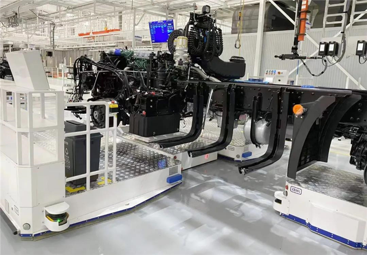 大體積、大重量的產(chǎn)品如何實現(xiàn)生產(chǎn)裝配環(huán)節(jié)的柔性輸送,一直都是汽車制造工廠裝配工藝的難點。新松開創(chuàng)性地將移動機器人雙車聯(lián)動轉(zhuǎn)彎技術(shù)在重載、超長物體運輸環(huán)節(jié)投入應(yīng)用,終結(jié)了國內(nèi)重卡移動機器人裝配線只能“一線到底”的尷尬局面,有效解決了市場痛點。