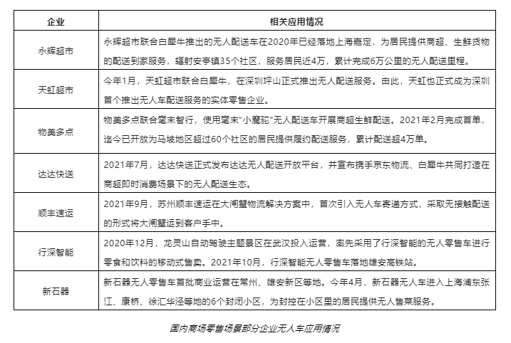 而商超配送方面,由于線下市場仍是主力,目前多以合作探索為主。如白犀牛與永輝超市、天虹超市,毫末智行與物美多點等,這些企業已經在部分地區實現了常態化運營。