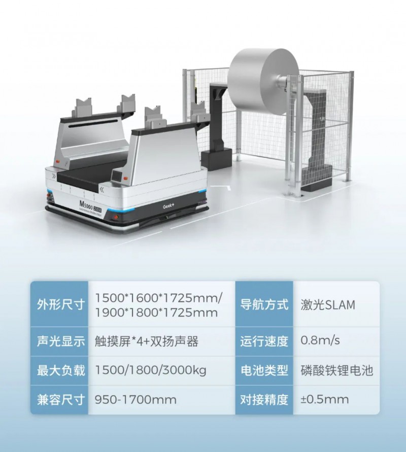 極智嘉雙舉升機器人采用激光傳感器,融合視覺算法,實現與機臺、緩存架的精準對接,各向對接精度可達±0.5mm。搭配使用光電傳感器,可識別出料軸在叉臂上發生的位置偏移,并調整動作自動糾偏,有效防止拖料、掉料,降低安全風險和生產損失。